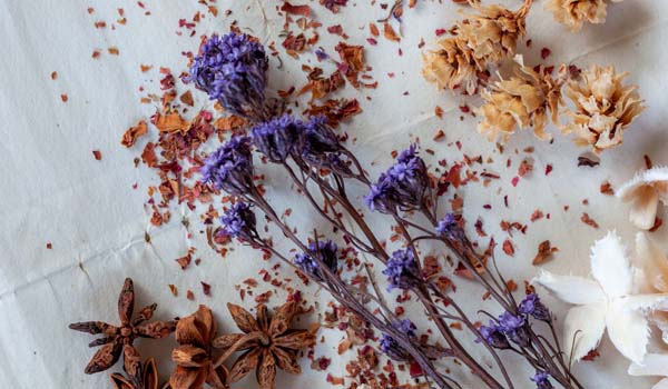 ドライフラワーのもうひとつのクリエイティブな使い方は、ポプリだ。ポプリとは、ドライフラワーやハーブ、スパイスを混ぜ合わせたもので、部屋に香りを添えるために使う。ポプリを作るには、ドライフラワーに、ラベンダー、ローズマリー、シナモンなど、香りのよいハーブやスパイスをお好みで混ぜるだけ。混ぜ合わせたものを装飾用のボウルやサシェに入れて、自然の香りを楽しみましょう。