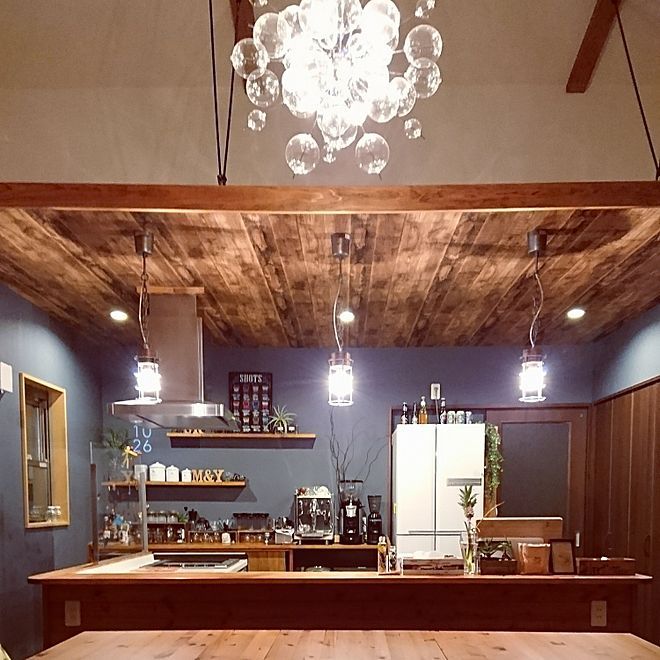 低色温度(2700K前後)の柔らかい光で、ブルー・グリーン・ホワイト系のボトルが落ち着きを演出。